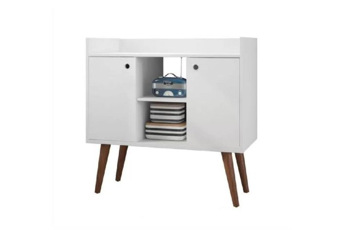 Possui estrutura produzida em MDP de 12 e 15 mm e acabamento com pintura UV na cor branco brilho. Possui duas portas produzidas em MDP de 12 mm. As dobradiças utilizadas nas portas são metálicas de pressão 26 mm . O sistema de montagem é feito com parafusos e cavilhas. Possui pés em madeira estilo retrô e os puxadores são redondos modelo olhal embutido. O sistema de embalagem é feito com tampo e fundo, o qual aumenta a proteção dos volumes no transporte e manuseio