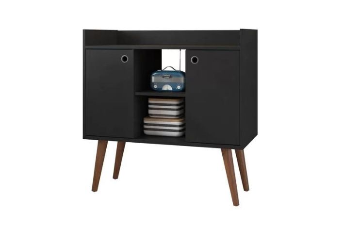 Possui estrutura produzida em MDP de 12 e 15 mm e acabamento com pintura UV na cor branco brilho. Possui duas portas produzidas em MDP de 12 mm. As dobradiças utilizadas nas portas são metálicas de pressão 26 mm . O sistema de montagem é feito com parafusos e cavilhas. Possui pés em madeira estilo retrô e os puxadores são redondos modelo olhal embutido. O sistema de embalagem é feito com tampo e fundo, o qual aumenta a proteção dos volumes no transporte e manuseio
