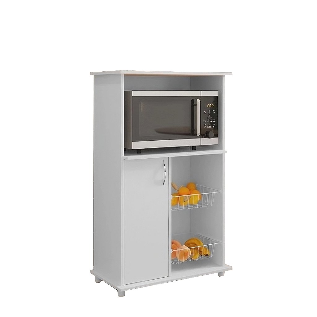 Possui ainda 02 cestos em aramado oxidado branco para você guardar frutas e verduras, 01 porta com dobradiças metálicas e 01 prateleira interna.