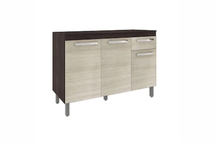 Possui estrutura produzida em MDP de 12 e 15mm, com portas de MDP de 15mm. Acabamento UV. As dobradiças são modelo caneca de pressão 26mm e as corrediças metálicas. O sistema de montagem é feito na cor cinza e os puxadores são cromados. O sistema de embalagem é feito com tampo e fundo, o qual aumenta a proteção dos volumes no transporte e manuseio.