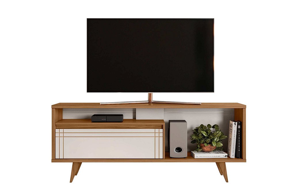 Com design moderno e pintura UV, este rack com porta basculante e pistão a gás acomoda TVs de até 60" e traz elegância e funcionalidade para sua sala.