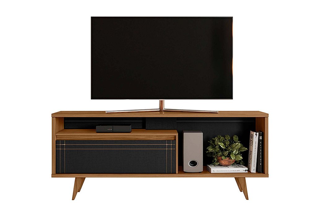 Com design moderno e pintura UV, este rack com porta basculante e pistão a gás acomoda TVs de até 60" e traz elegância e funcionalidade para sua sala.