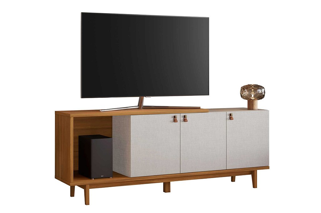 Transforme sua sala com este rack bancada que une estilo e funcionalidade! Com 3 portas com puxadores em couro sintético, nicho espaçoso e pés em madeira maciça, ele é perfeito para TVs de até 50". Um toque de sofisticação e praticidade para o seu dia a dia!