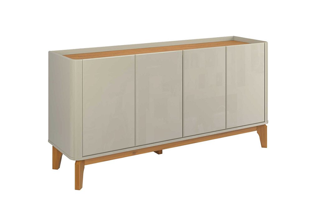 Este buffet combina design e funcionalidade com seus cantos arredondados e pés em madeira maciça. As portas com puxador clean e fechamento suave (slow motion) revelam prateleiras internas que oferecem uma organização impecável para seu ambiente. É a peça perfeita para adicionar elegância e praticidade.