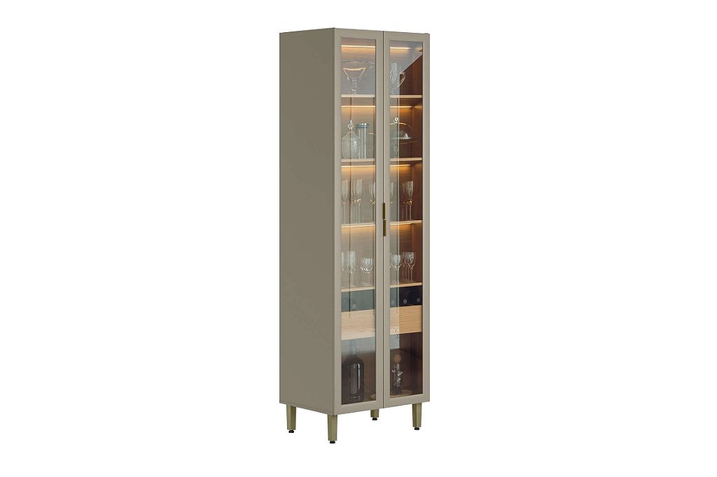 Cristaleira elegante 100% MDF, perfeita para compor cozinhas modulares com estilo e funcionalidade. Possui iluminação em LED que valoriza a exposição das peças. Gavetas com corrediças telescópicas garantem abertura suave e durabilidade.