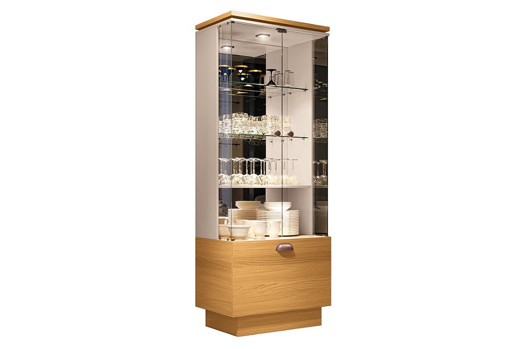 Cristaleira sofisticada e elegante, com portas e prateleiras de vidro 6mm, sistema de fecho magnético e laterais fixadas com suportes cromados que valorizam o design. Possui espelhos ao fundo, iluminação em LED que realça os objetos, além de gavetão com corrediças telescópicas e nicho adega embutido para até 6 garrafas. Sua estrutura mista garante resistência e durabilidade.