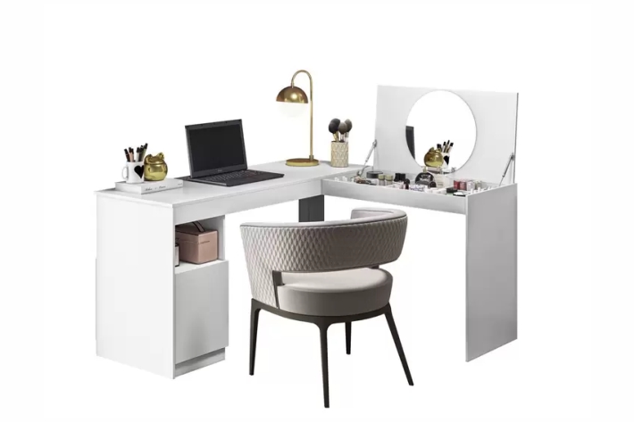 Possui estrutura produzida em MDP de 12 e 15 mm, tampo e porta em MDP de 15 mm. Acabamento interno e externo com pintura UV na cor branco brilho. As dobradiças utilizadas nas portas são metálicas de pressão 26 mm. O sistema de montagem é feito com parafusos, cavilhas e minifix. Possui sapatas e divisores do organizador em PVC. O espelho e o vidro sobre o organizador possuem 3 mm de espessura. O tampo em que o espelho é fixado é em MDP de 15mm e possui dois pistões a gás de 80n, permitindo que o tampo seja abaixado. Internamente, possui uma prateleira com ótimo espaço.