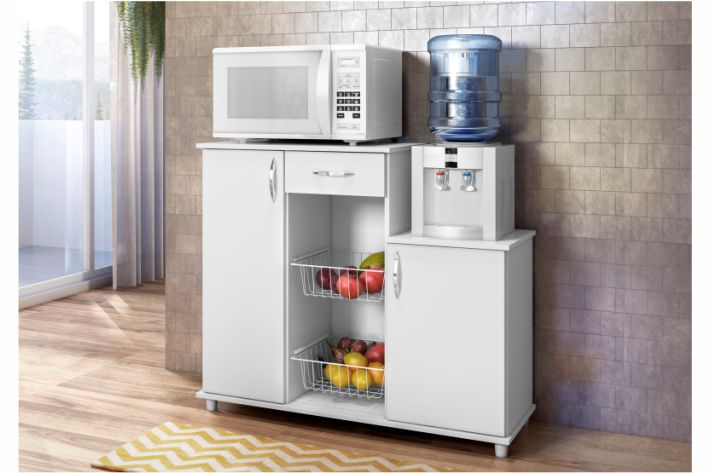 Na sua prateleira interna, é possível guardar os alimentos ou eletrodomésticos de modo que fiquem protegidos. No tampo pode-se apoiar o forno micro-ondas com segurança.