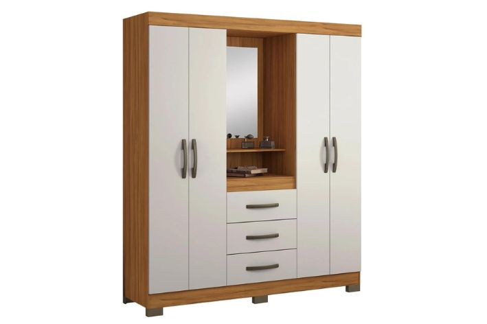 Um clássico que é sucesso a muito tempo, o Guarda-Roupa NT 5015, possui o famoso modelo Capelinha com espelho centralizado. Ele possui um amplo espaço, e sua estrutura é formada por 3 gavetas externas, um calceiro e um cabideiro em madeira e 3 prateleiras para uma melhor organização.
