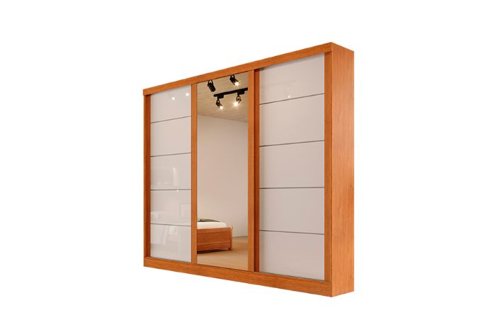 Guarda-roupa com estrutura 100% MDF, que une resistência e acabamento de alta qualidade. Possui 3 portas de correr, sendo a central com espelho e película de segurança, além de 4 gavetas com corrediças telescópicas para maior praticidade. Os puxadores em MDF e o cabideiro em alumínio com pintura UV completam o design funcional e elegante.