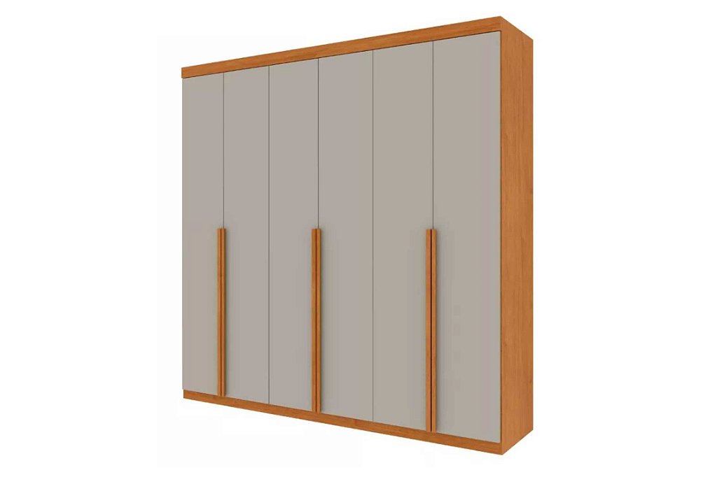 Guarda-roupa 6 portas em MDF com acabamento de alta qualidade, ideal para um quarto moderno e organizado. Possui cabideiros em alumínio, dobradiças reforçadas de 26mm (3 por porta) e corrediças telescópicas que garantem suavidade no uso. É a combinação perfeita entre durabilidade, praticidade e design.
