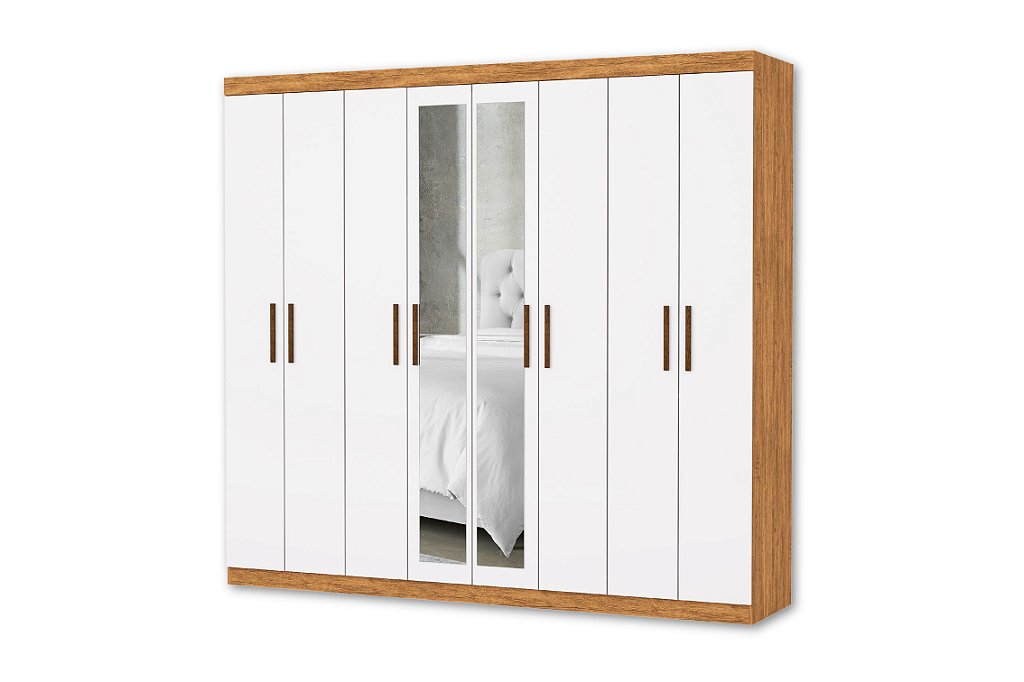 Guarda-roupa sofisticado em MDP, com 8 portas (sendo 2 com espelhos) e 2 gavetas, oferecendo organização prática e um toque de elegância. Perfeito para compor ambientes modernos com funcionalidade e estilo impecáveis!