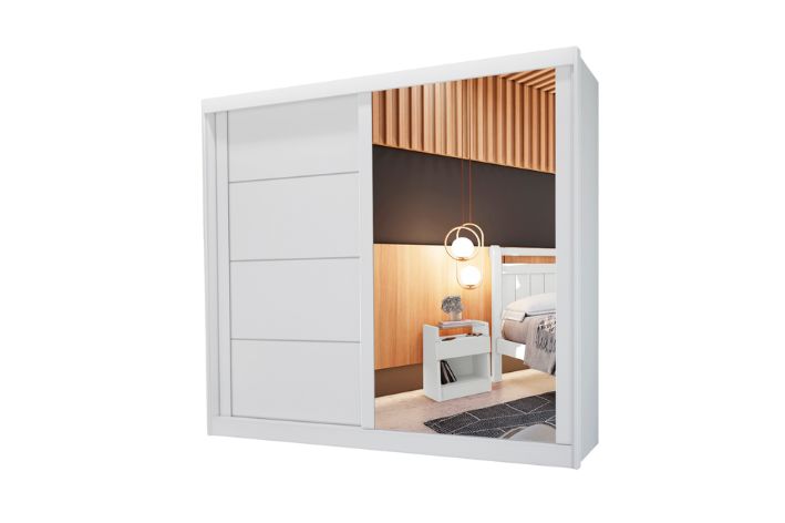Amplo espaço interno, gavetas com corrediças telescópicas, prateleiras centrais e espaço para roupas longas, cabideiros em alumínio, portas deslizantes com encabeçamento e puxadores em mdf. Portas em mdf.