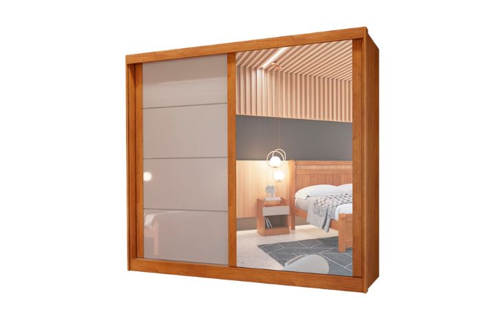 Amplo espaço interno, gavetas com corrediças telescópicas, prateleiras centrais e espaço para roupas longas, cabideiros em alumínio, portas deslizantes com encabeçamento e puxadores em mdf. Portas em mdf.