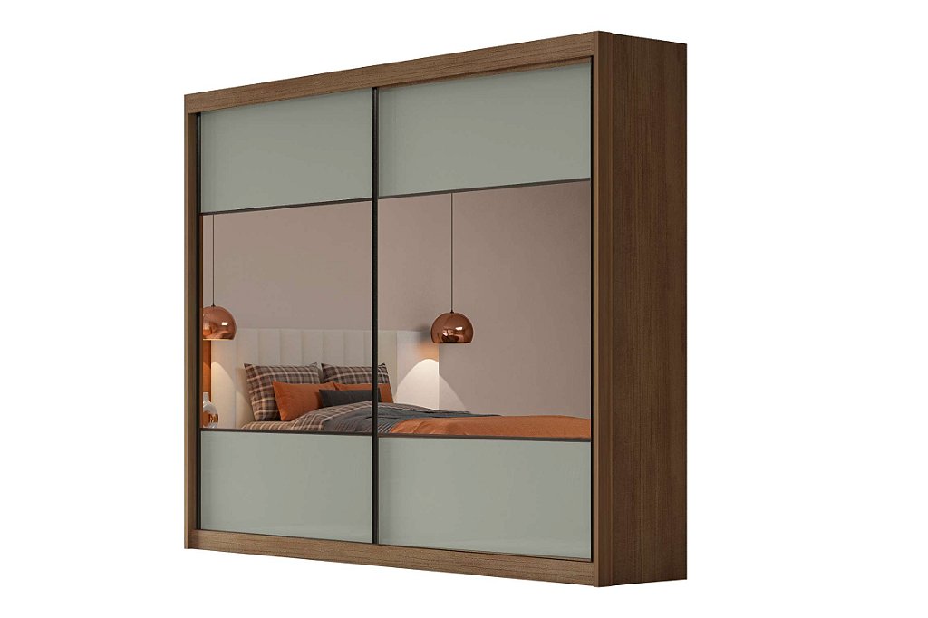 Guarda-roupa 100% MDF com estrutura reforçada e coluna central de 25mm, garantindo durabilidade e resistência. Conta com trilhos inferiores em alumínio e roldanas com amortecedor para um deslizamento suave das portas. Possui espaço Ele e Ela, 8 gavetas espaçosas e 2 espelhos elegantes que valorizam o ambiente.