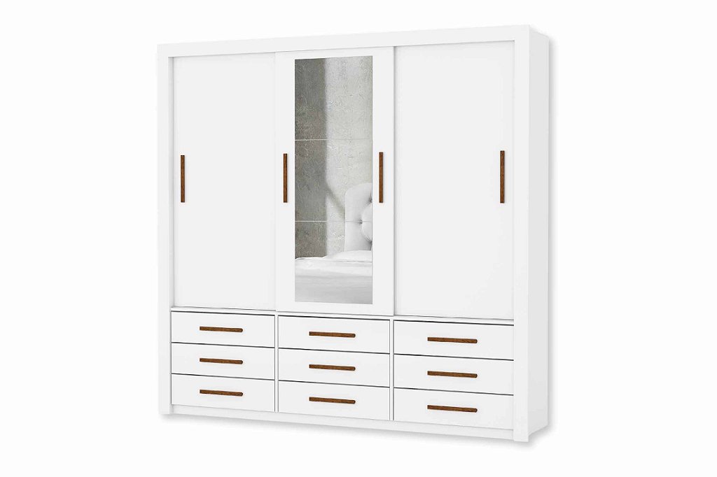 Guarda-roupas moderno e versátil, com 3 portas (sendo 1 com espelho) e 9 gavetas amplas, tudo em MDP. Ideal para quem busca organização impecável e um design que eleva qualquer ambiente!