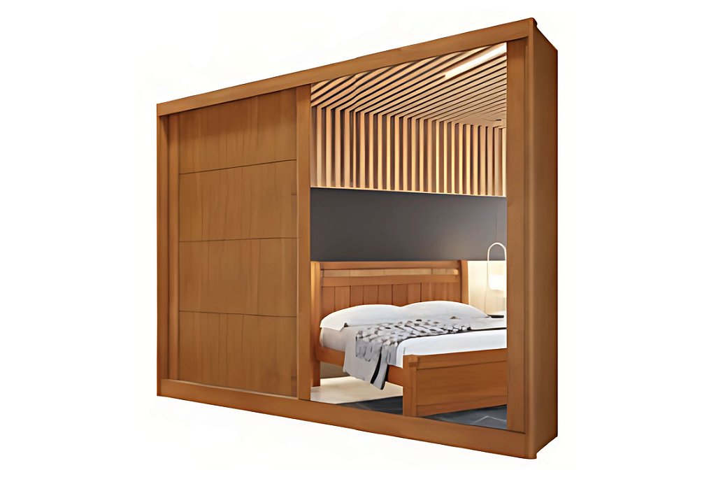 Amplo espaço interno, gavetas com corrediças telescópicas, prateleiras centrais e espaço para roupas longas, cabideiros em alumínio, portas deslizantes com encabeçamento e puxadores em mdf. Portas em mdf.