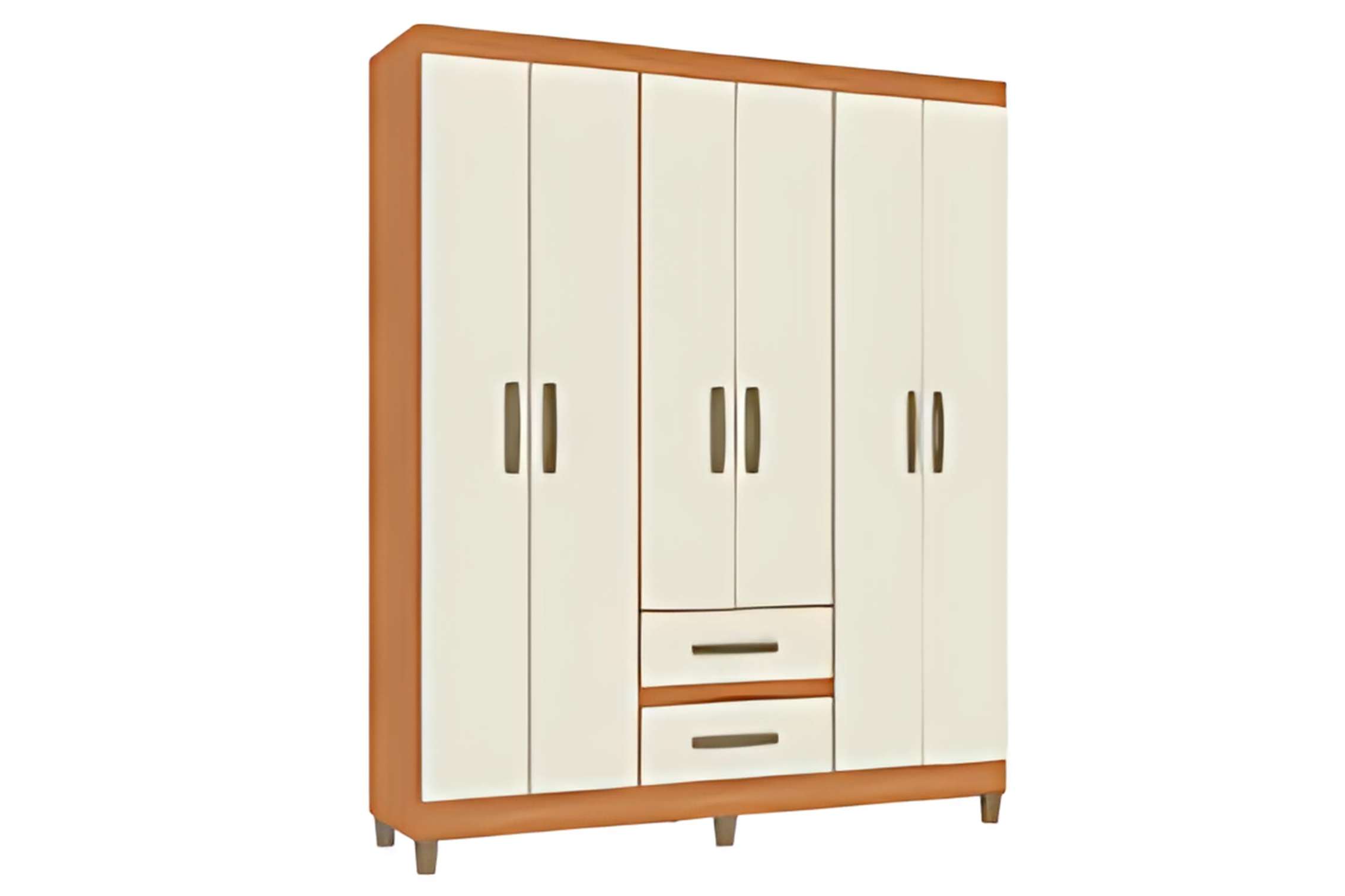Guarda-roupa com estrutura em MDP de 12mm na caixa e frentes, unindo resistência e durabilidade.Conta com 6 portas e 2 gavetas com corrediças telescópicas, que proporcionam abertura suave e eficiente.
