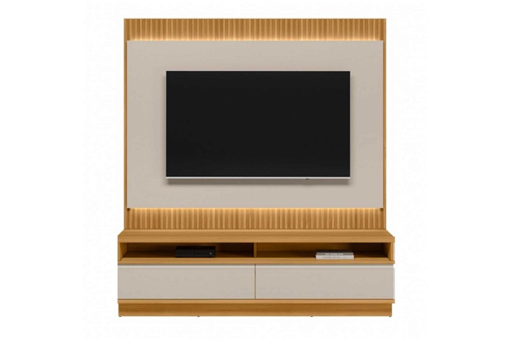 O detalhe ripado no painel traz sofisticação, enquanto a iluminação em LED cria um ambiente acolhedor.