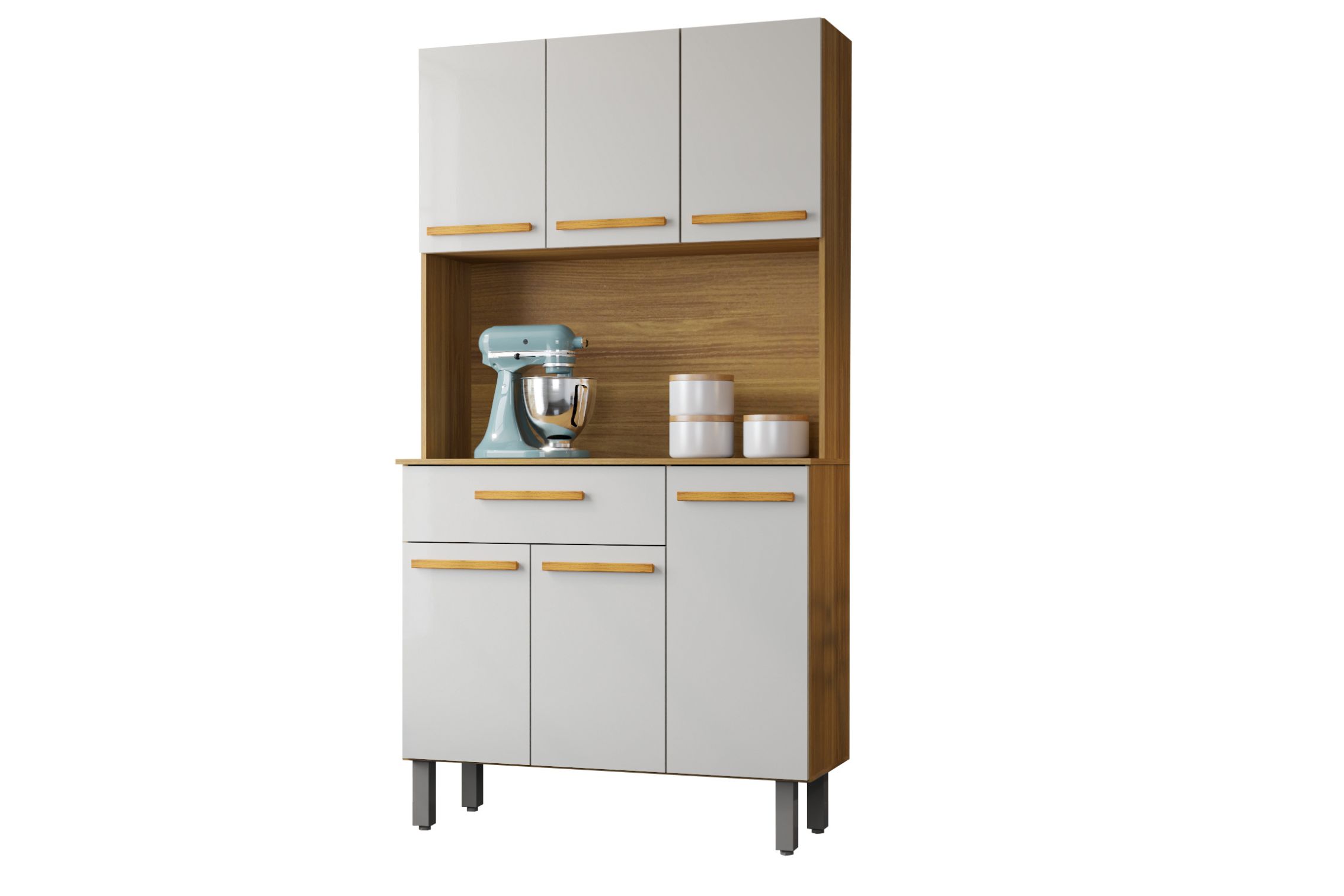 Kit cozinha com acabamento em pintura UV, trazendo um visual moderno e prático para o dia a dia. Possui dobradiças metálicas de pressão, gaveta com corrediças metálicas e puxadores em MDF revestido, garantindo funcionalidade e um bom acabamento para sua cozinha.