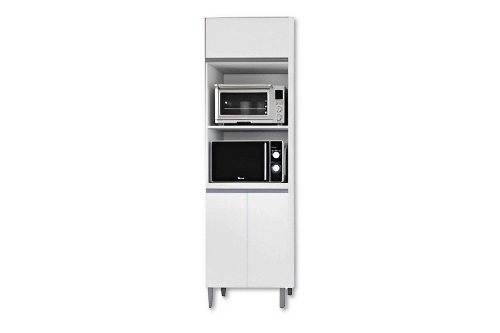 Possui estrutura produzida em MDP de 12 e 15 mm, com portas e frentes de gavetas em MDP de 15 mm. Acabamento UV na cor Branco Brilho. As dobradiças são modelo caneca de pressão 26mm e as corrediças são metálicas. O sistema de montagem é feito com parafusos e cavilhas. Os pés são em PVC com regulagem na cor cinza e os puxadores em ABS modelo perfil. Possui na porta superior um vidro reflecta que dá um toque a mais de beleza ao móvel. O sistema de embalagem é feito com tampo e fundo, o qual aumenta a proteção dos volumes no transporte e manuseio.