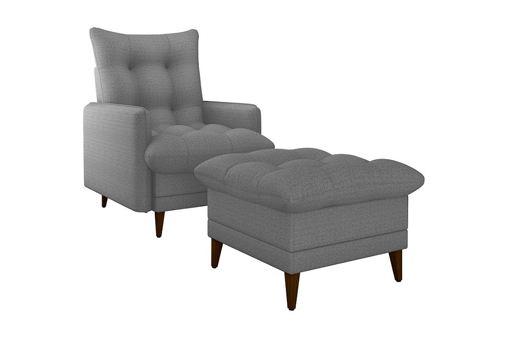 Conforto garantido com a poltrona reclinável com puff, ideal para momentos de descanso. Possui espuma D23, encosto e assento com fibra siliconada e flocos de espuma que se moldam ao corpo. Estrutura resistente em madeira de eucalipto de reflorestamento.