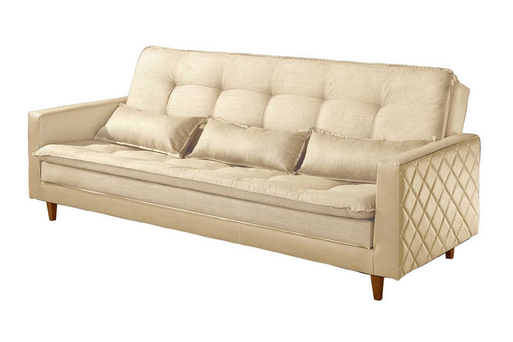 Este sofá cama acomoda tranquilamente 3 pessoas sentadas e duas deitadas, ele pode ser utilizado em 02 posições diferentes, espumas de alto conforto com a densidade tanto no assento como no encosto Espuma D-26, com percintas elástica ,acompanha 3 almofadas que podem ser usadas como travesseiro. A espuma D26 tem uma boa densidade, suportando por assento até 100 kg.