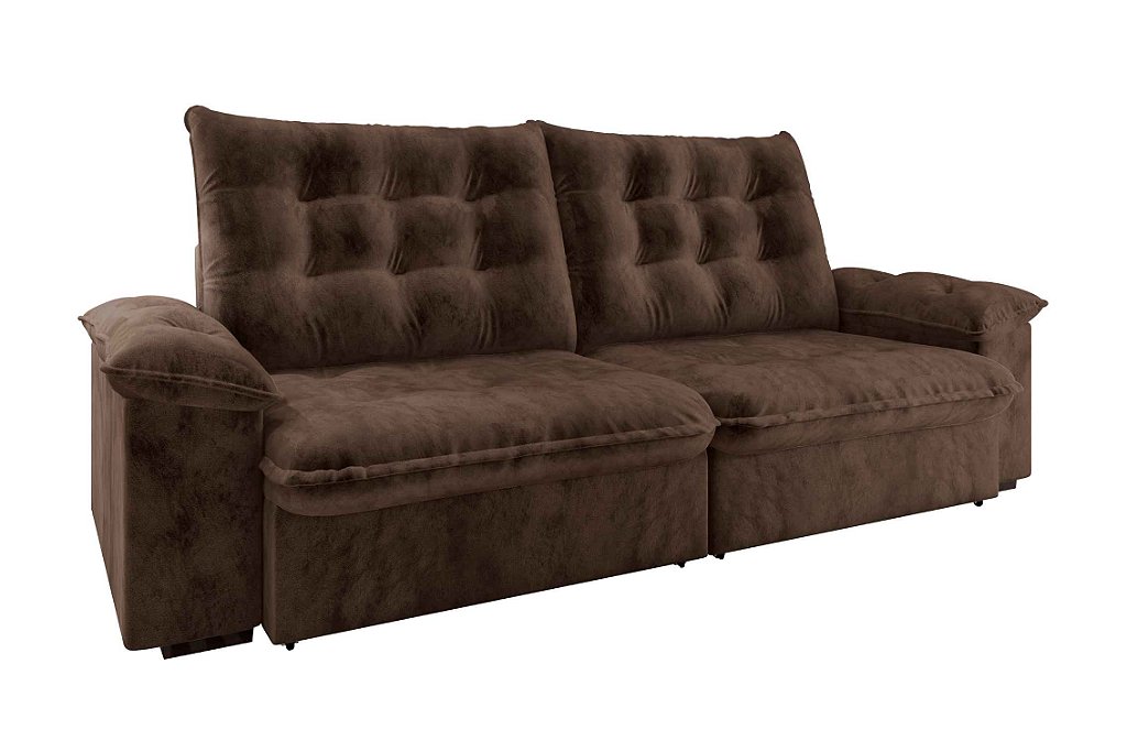 Aproveite o conforto do sofá retrátil com assento em espuma D23, encosto fixo reclinável e percinta elástica, suportando até 100kg por assento!